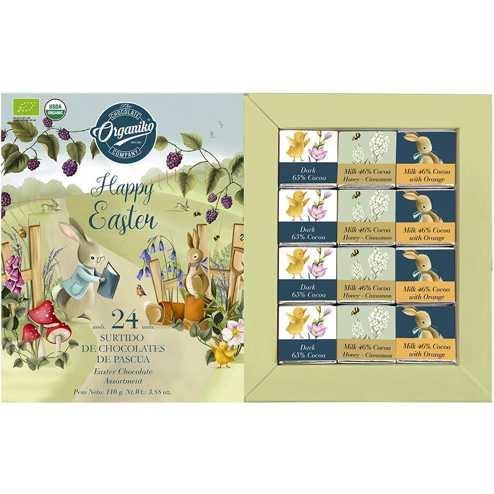 Chocolate Organikos populära chokladask innehåller 24 styckförpackade chokladbitar i en ny, stämningsfull påskdesign. Asken pryds av påskharar i spansk vårsol och varje chokladbit har sin egen matchande påskdesign.